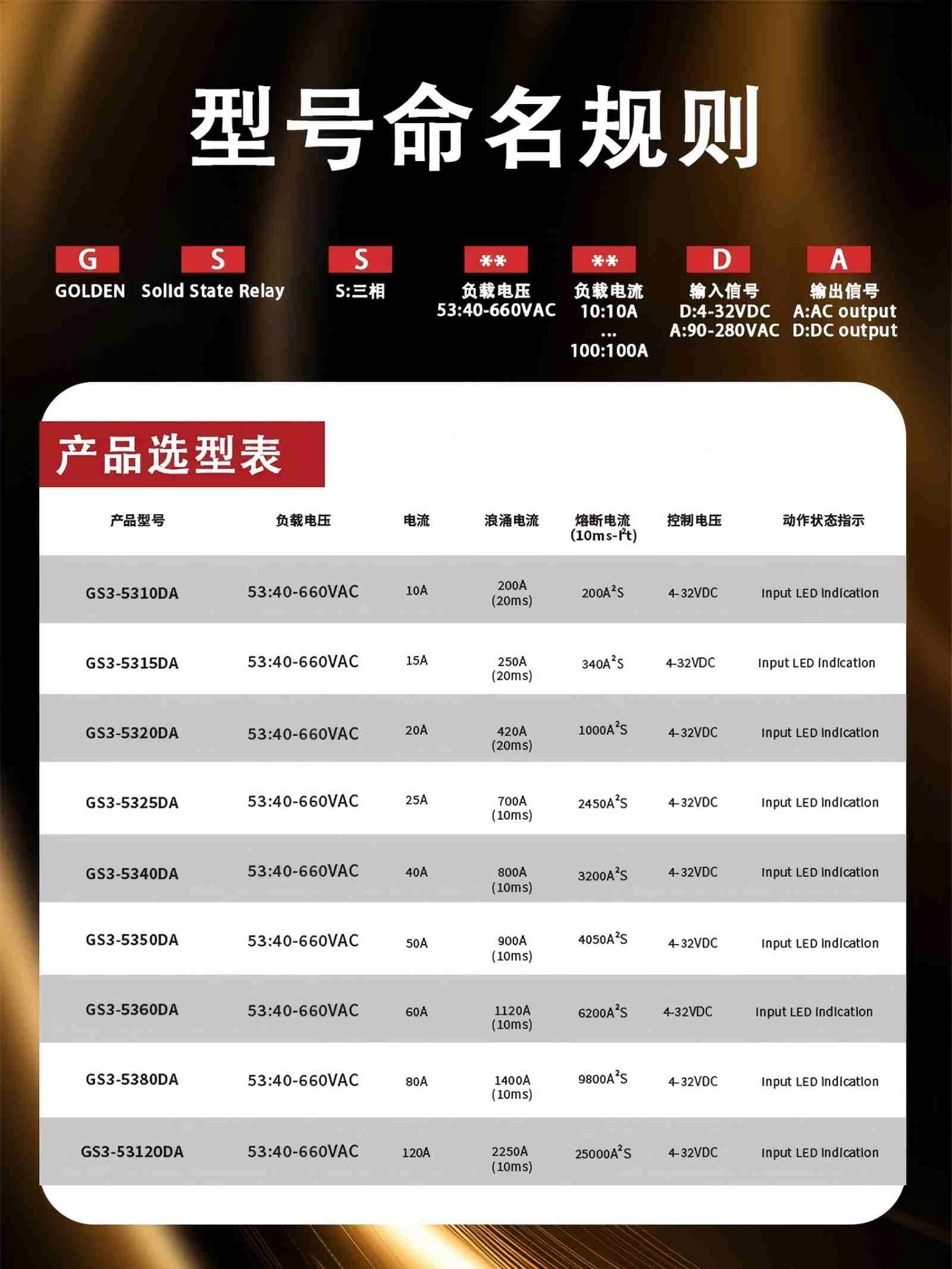 | GS353120DA | 53:40-660VAC | 120A | 4-32VDC | ≤2500VAC | ≥2500VAC | 输入LED灯指示 | 联系销售专员 |