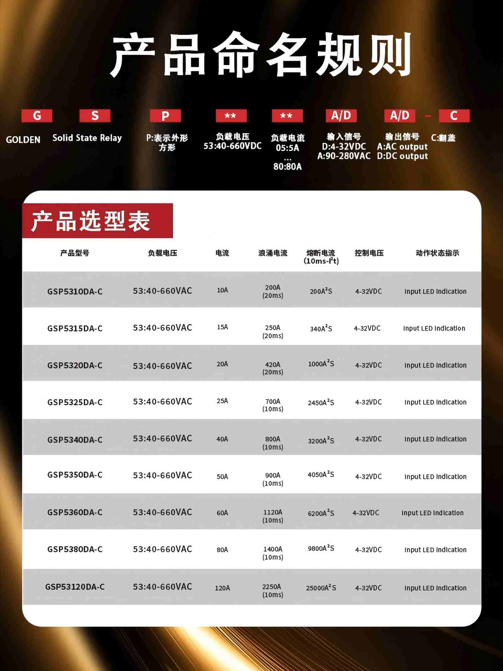 | GSP53120DA-C | 53:40-600VAC | 120A | 4-32VDC | ≥2500VAC | 输入LED指示灯 | ||||