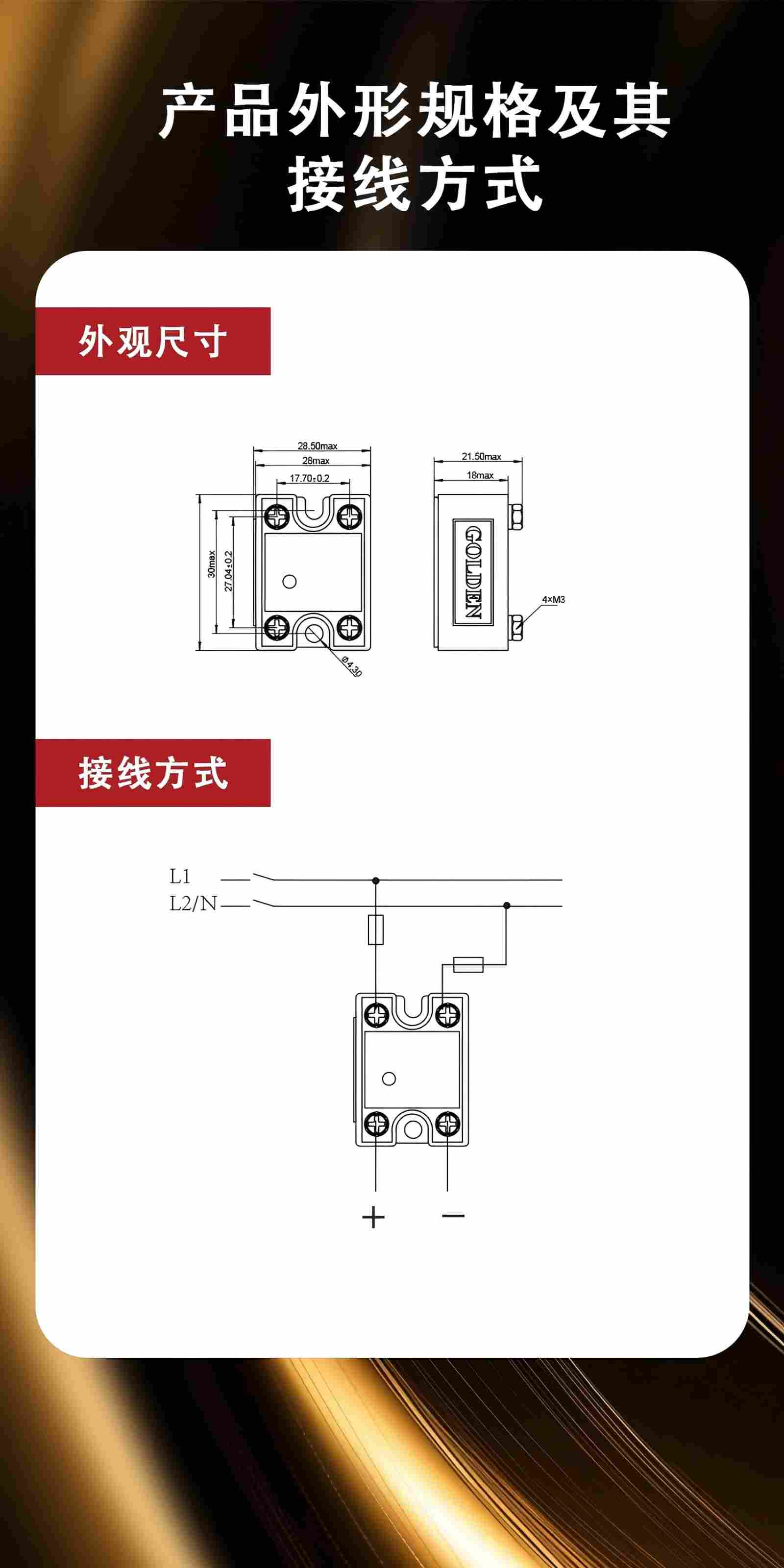 GSQ为面板安装型交流固态继电器。产品结构紧凑,体积小巧,节省面板空间。和标准方块形固态继电器相比,GSQ系列可以节省70%的空间。输入输出之间采用光电隔离,介质耐压达到。内置RC吸收回路,采用环氧树脂灌封。